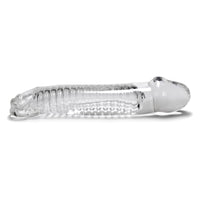 The Oxballs Muscle Cock Sheath Clear is modelled on the Oxballs Gym-Boy. This clear penis enhancer doesn't just add length and size to your penis, it also features ridges on the inside that stimulate you with every thrust. This toy looks just as good as it feels, adding visual pleasure to your session. It comes with a silicone stopper that locks into the grooved indents at the length that suits your own penis. This toy is free from phthalates, and is non-toxic and easily cleaned. Add a water-based lubricant for enhanced pleasure and sensation. It measures 20.32 inches.